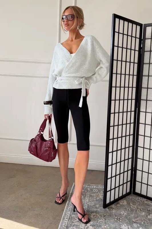 Why It Works: This is a perfect outfit for a lunch date, a shopping trip, or a casual day out. The wrap cardigan defines the waist and adds a touch of elegance, while the leggings keep it comfortable. The thong heel sandals elevate the look.