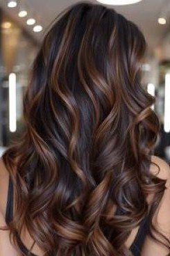 Description: This style features a soft mocha brown base with very fine, delicate highlights around the face. The rest of the hair is left dark. The waves are soft and romantic. You will need a small curling wand and a lightweight hairspray. The vibe is subtle, natural, and very wearable.