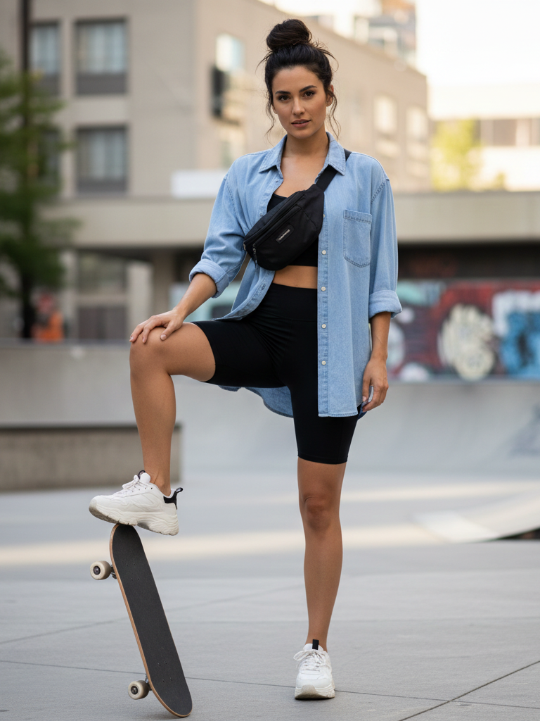 Description: Black high-waisted biker shorts paired with an oversized men’s-style button-down shirt in chambray or light denim. Leave the shirt open and untucked. Add chunky sneakers and a fanny pack.
