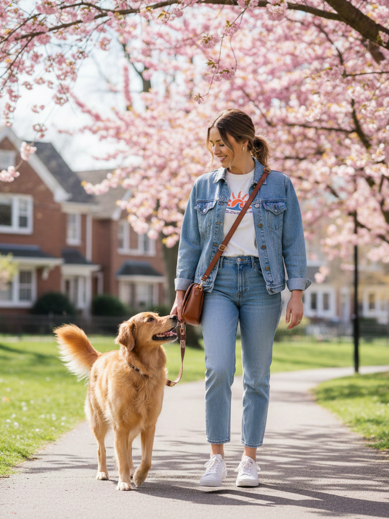 Description: Start with your favorite pair of medium-wash straight-leg jeans. Add a simple graphic t-shirt in a soft fabric. Layer a lightweight denim jacket over it. Finish with white sneakers and a crossbody bag.