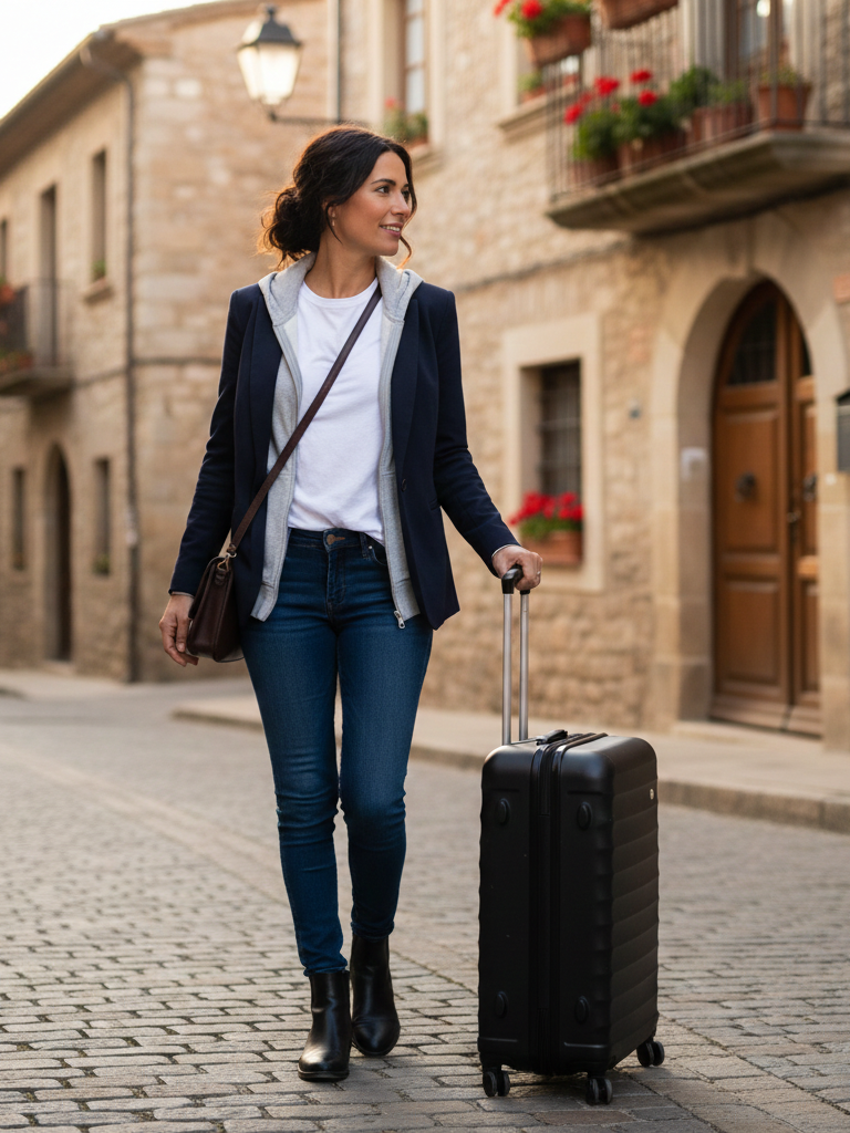 Why It Works: This is the ultimate flexible travel outfit. The blazer dresses it up for a nice dinner at your destination. The hoodie provides cozy comfort for the journey. You’re prepared for any activity or temperature.