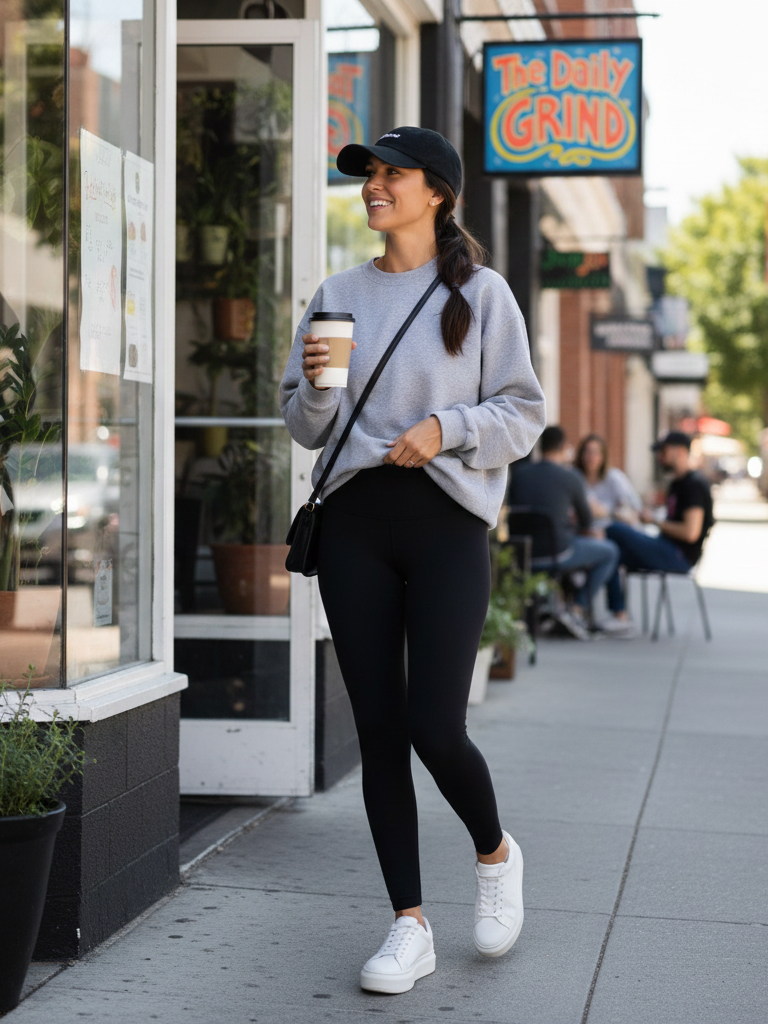 Description: High-quality black leggings that are fully opaque. Pair them with an oversized, soft grey sweatshirt. Add white platform sneakers and a baseball cap for a sporty vibe.