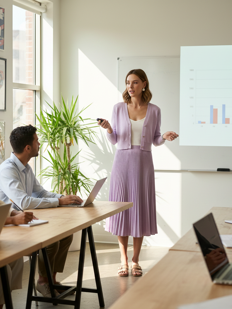 Why It Works: Matching sets do the work for you. They look expensive and intentional. This particular set is feminine, soft, and perfect for a creative workplace or a special school day.