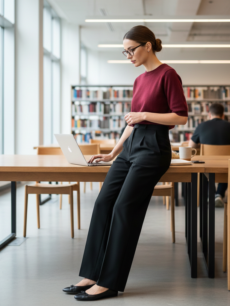 Pro Tip: Tuck the front of your sweater into the trousers for a defined waist. Choose a sweater in a merino wool or cotton blend that won’t overheat you indoors. A sleek tote bag completes the look.
