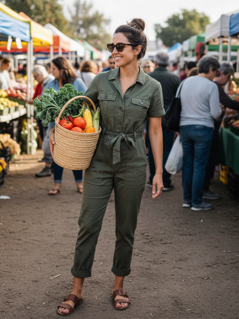 Why It Works: A jumpsuit means you’re fully dressed in one piece. No matching needed. The utility style is practical, comfortable, and looks put-together instantly. It’s great for a day of activities.