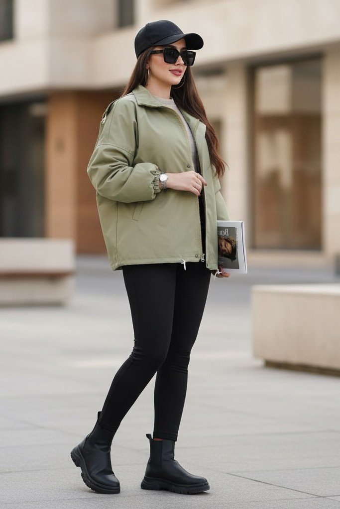 When function meets fashion for the work commute. A sleek, sage green zip up parka is a stylish and practical outer layer. It is worn over a simple top and black skinny pants. Chunky black Chelsea boots are weather ready and professional.