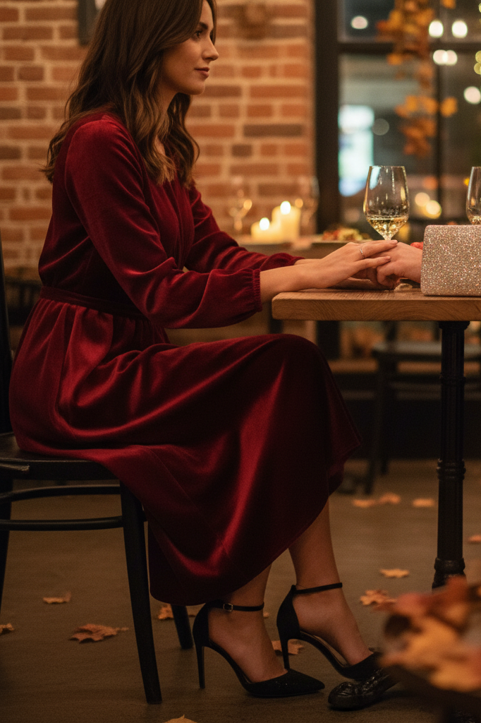 Description: A long-sleeved velvet midi dress in a jewel tone like ruby red or amethyst purple is paired with statement heels and a clutch bag.