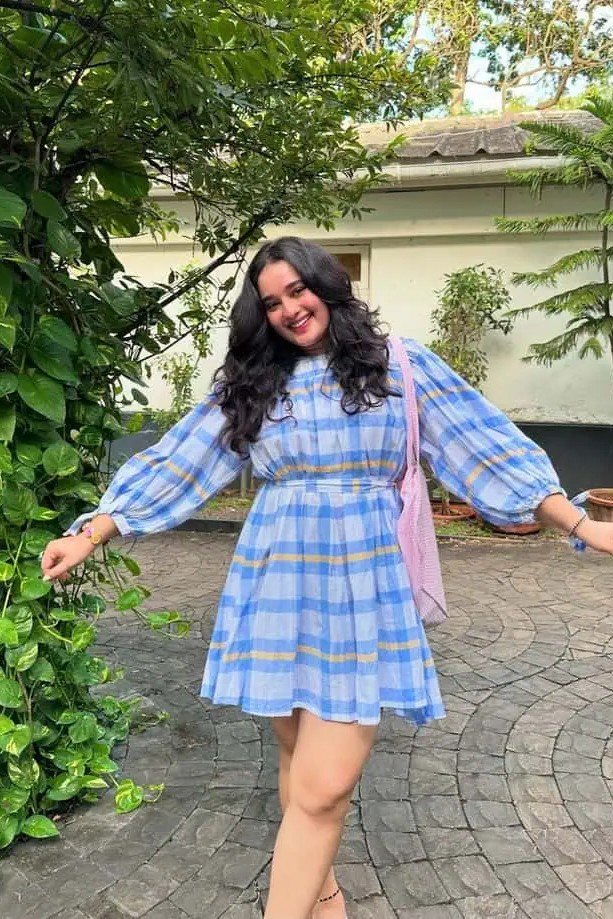 14. Blue and White Plaid Puff Sleeve Mini Dress + Pink Tote Bag
