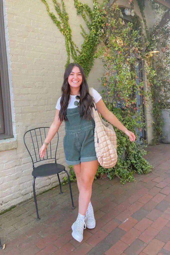 19. Green Denim Overalls + White T Shirt + White High Top Sneakers