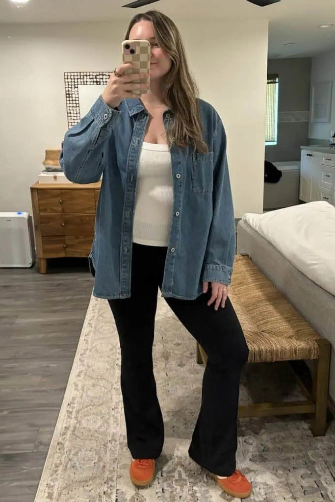 7. Oversized Denim Button Down + White Tank Top + Black Flared Leggings + Orange Sneakers