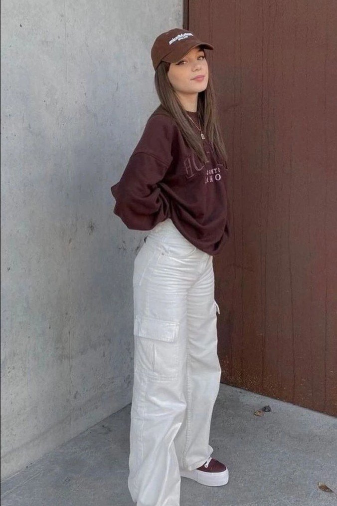 30. Dark Brown Graphic Sweatshirt + White Wide-Leg Cargo Pants + Brown Baseball Cap + Burgundy Platform Sneakers