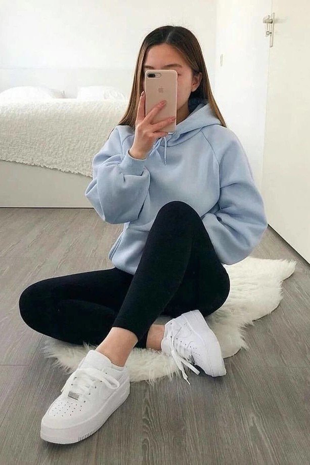 This look is streetwear inspired and super comfy. A light blue oversized hoodie is soft and springy. Black leggings are the reliable base. Classic white Air Force 1s add a clean, trendy finish.