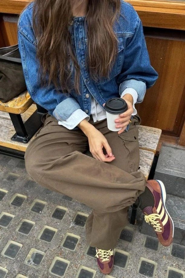 This outfit is a mashup of cool trends. A medium wash denim jacket is a spring essential. Brown cargo pants add a utilitarian vibe. Retro sneakers in burgundy and yellow tie the earth tones together.