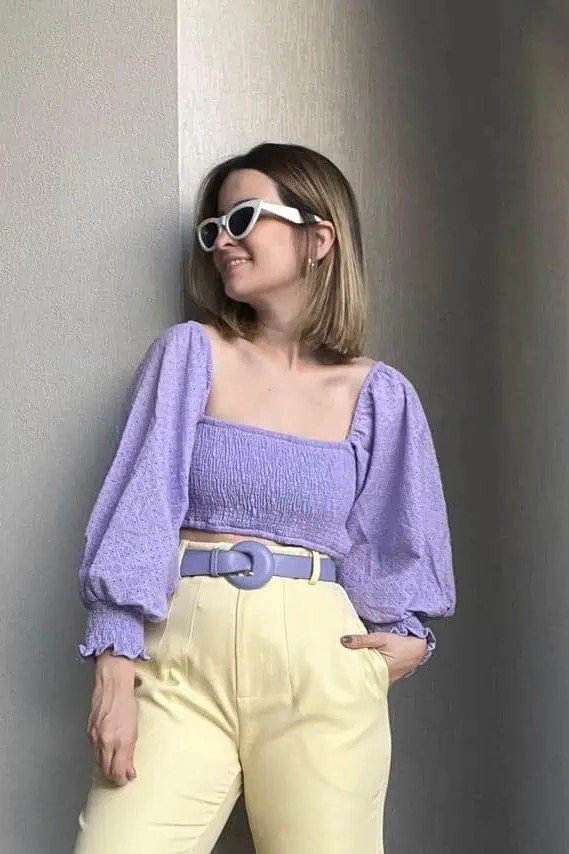 This outfit is feminine and fresh. A purple smocked crop top has sweet detail. It is paired with soft, pale yellow trousers. A matching purple belt ties the colors together.