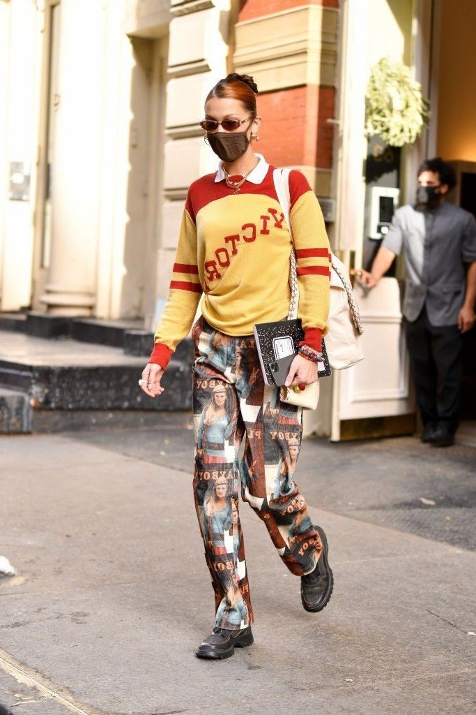 22. Yellow and Red Vintage Graphic Sweater + Multi-Print Playboy Trousers + Black Lug Sole Shoes