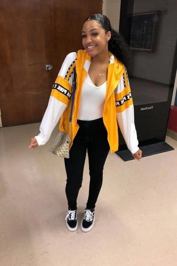 This outfit is retro and sporty. A cheerful yellow and white windbreaker is the key layer. It is worn over a simple white v neck tee. Black skinny jeans and classic Vans keep the look grounded.