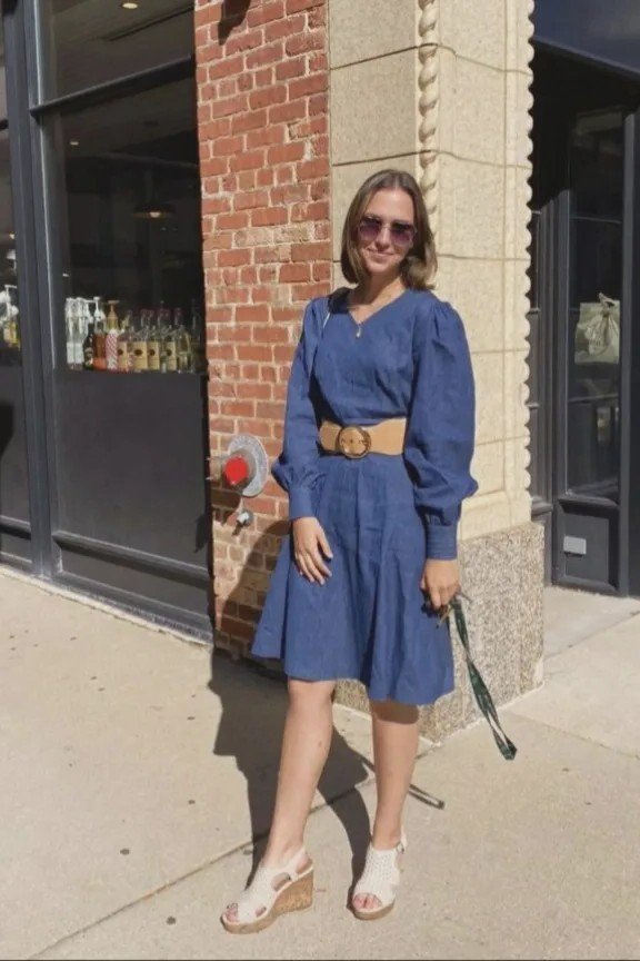 Description: This look is a chic, elegant, and effortlessly corporate hippie ensemble. A beautiful navy V-neck puff-sleeve dress is sophisticated and feminine. The puff sleeves add a touch of romance, and the V-neck is flattering. A tan waist belt cinches the waist, and white wedge sandals complete this polished, summer-ready look.