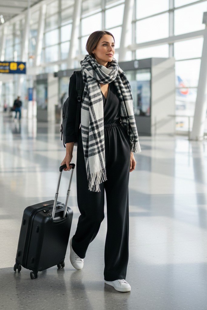 Why It Works: A jumpsuit is a complete outfit with zero effort. It’s chic and comfortable for long travel days. The scarf doubles as a blanket or pillow. Sneakers ensure you can move quickly.