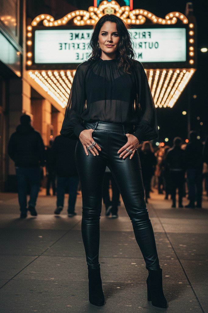Description: A sheer black poet blouse with billowy sleeves and a ruffled neck is tucked into high waisted, sleek black leather leggings or faux leather pants. Add black suede heeled booties and an abundance of silver rings and layered necklaces.
