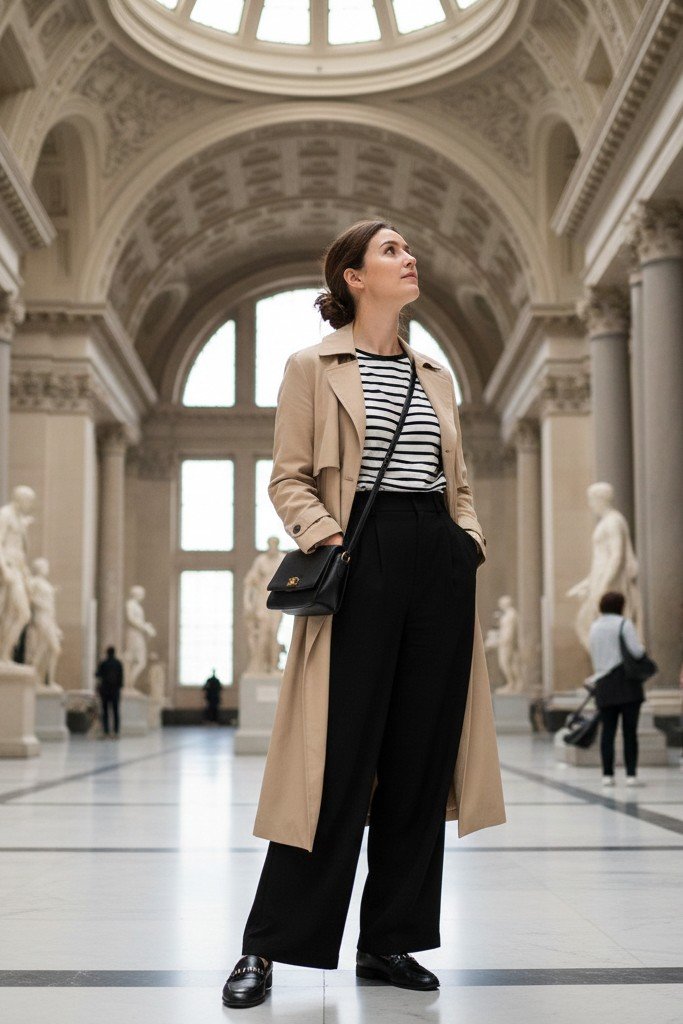 17. The Museum Explorer: Trench Coat + Striped Top + Wide Leg Pants