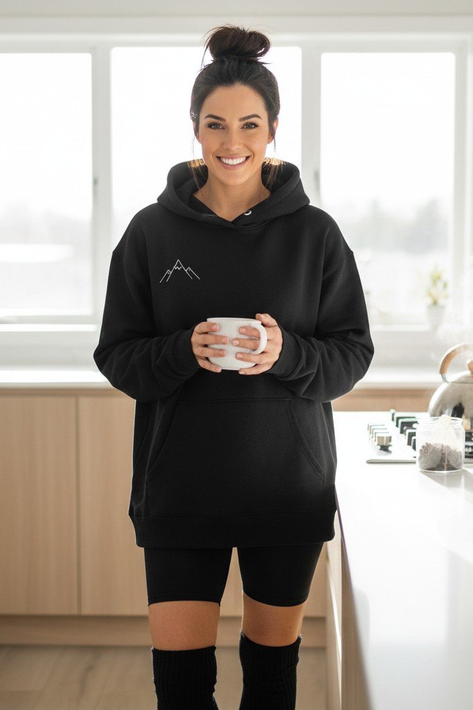 Description: A super soft, oversized black hoodie with a graphic or embroidery detail is worn over black high waisted biker shorts. Add thick, black ribbed socks pulled up slightly. Hair is in a messy bun.