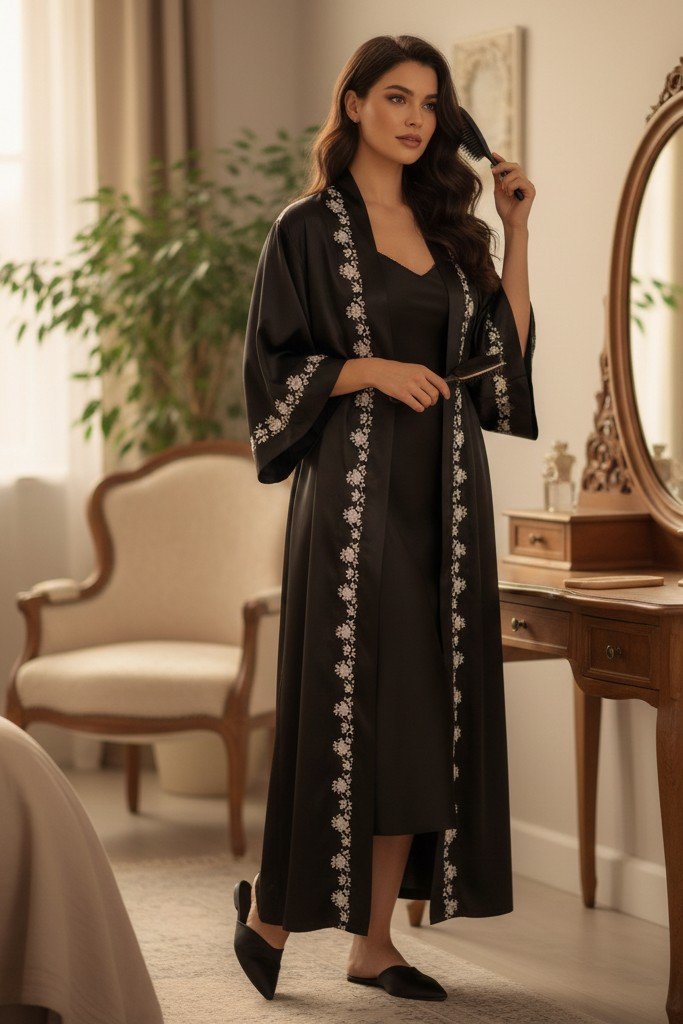 Description: A beautiful, long black robe with floral embroidery or lace details is worn open over a simple black spaghetti strap slip dress or tank and shorts set. Wear with black leather or satin mules.