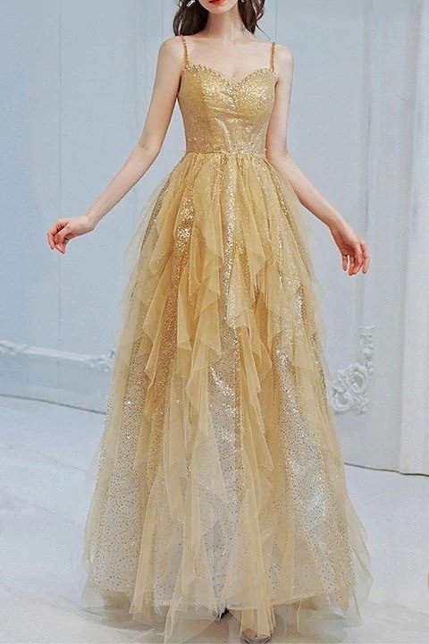 2. Gold Sequin Camisole Dress + Layered Tulle Ruffle Skirt + Spaghetti Straps