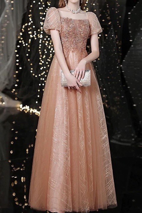 Description: This look is pure, romantic glamour. A stunning rose gold puff-sleeve gown is incredibly on-trend and feminine. The intricate beaded bodice adds incredible texture and sparkle, catching the light with every movement. Paired with a sleek silver metallic clutch, this dress is a show-stopping choice for a formal engagement party.