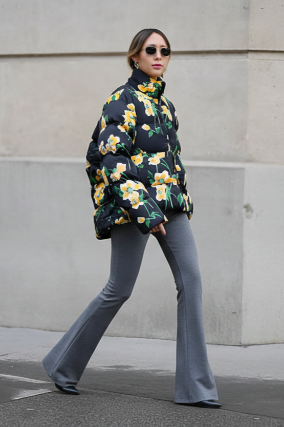 A playful mix of cozy and elegant. A black floral puffer jacket is warm, trendy, and feminine. Gray flared leggings are a sleek base. Black pointed heels elevate the look from casual to dressy.