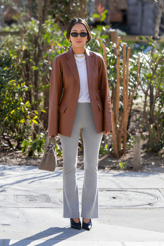 Edgy, sophisticated, and incredibly stylish. A brown leather blazer is a rich, textured statement. A simple white tee keeps it casual and fresh. Light gray flares and black pointed heels create a sleek, elongated base.
