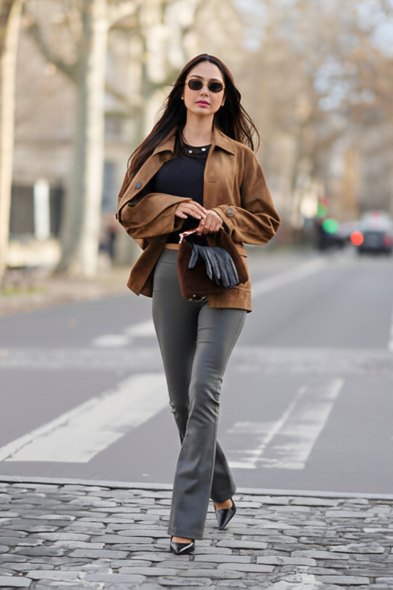 9. Brown Suede Jacket + Black Crop Top + Gray Flared Leggings + Black Pointed Heels