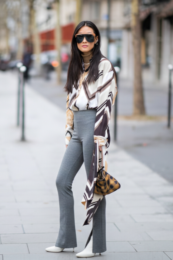 16. Geometric Print Blouse + Gray Flared Leggings + White Pointed Boots