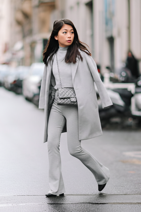 A head to toe tonal gray look that is the epitome of minimalist luxury. A matching gray overcoat and turtleneck create a sophisticated, cohesive top half. Light gray flares continue the monochrome palette. Black boots add a sharp contrast.