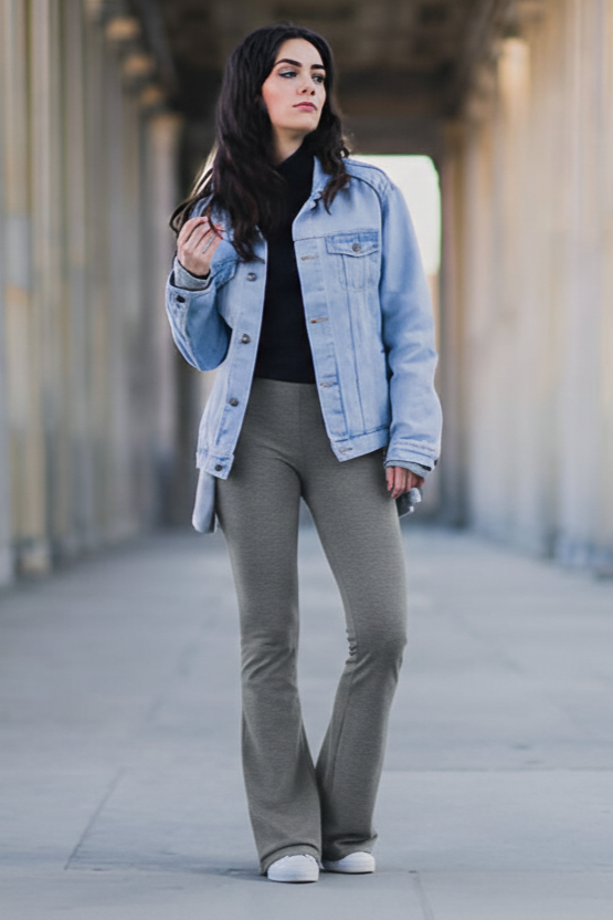 The key to a great gray flare leggings outfit is proportion. Because the bottom half has dramatic volume, you want a more fitted or intentionally balanced top half. Cropped tops, tucked in bodysuits, and structured jackets work beautifully. The right shoes, from pointed heels to platform sneakers, complete the look.