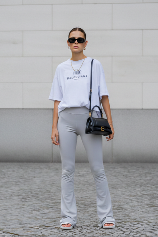 Simple, casual, and effortlessly cool. A white graphic tee adds personality and a fresh, clean vibe. Gray flared leggings are the perfect neutral base. Black sneakers ground the look with a sporty edge.