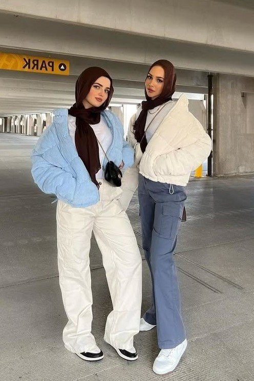 1. Light Blue and Cream Puffer Jackets + White and Grey Cargo Pants + Black and White Sneakers
