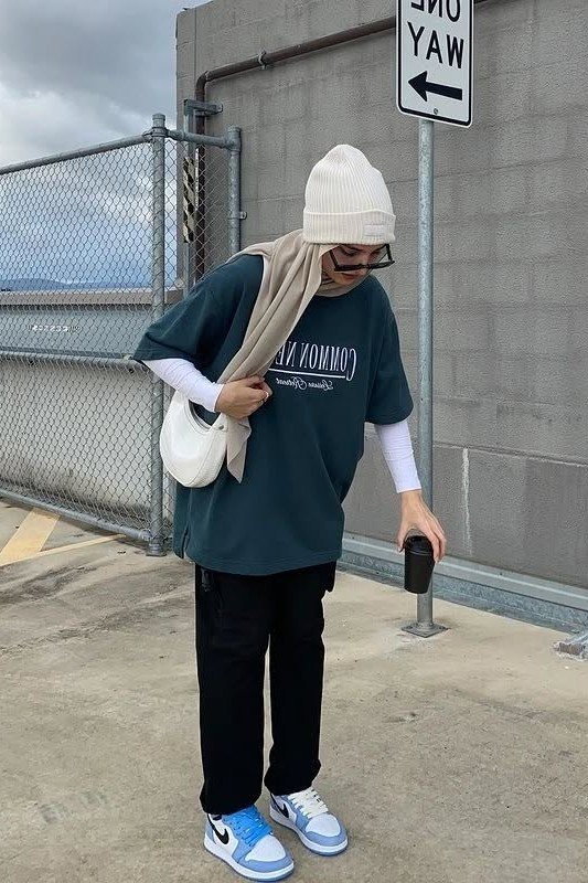 Pro Tip: The layered white long sleeve undershirt is the key to this look. It adds a stylish, layered detail to the oversized graphic tee.