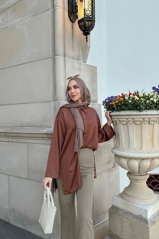 Description: This look is a stunning, color-coordinated ensemble perfect for a creative office. A rust brown oversized button-down shirt is stylish and relaxed. It is tucked into beautiful sage green flared trousers for a chic, retro-inspired silhouette. A mauve hijab adds a soft, complementary pop of color, and a white beaded bag completes this polished look.