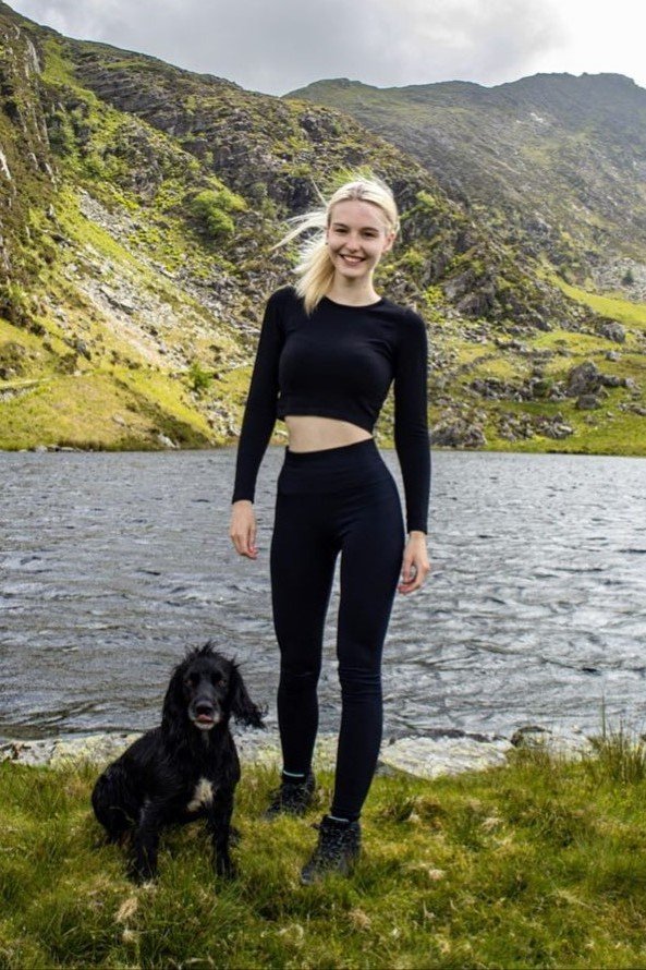 Description: This look is sleek, sporty, and perfect for a warm-weather hike. A breathable black long-sleeve crop top offers sun protection and moisture-wicking properties. High-waisted black leggings provide comfort and flexibility. Durable black trail boots offer excellent traction on various terrains.