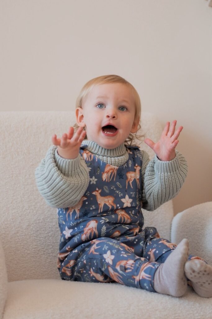 Description: This outfit is playful, unique, and perfect for a little one with a big personality. Fun animal print dungarees are the statement piece, paired with a simple green sweater. Beige socks add a neutral touch that grounds the playful pattern.