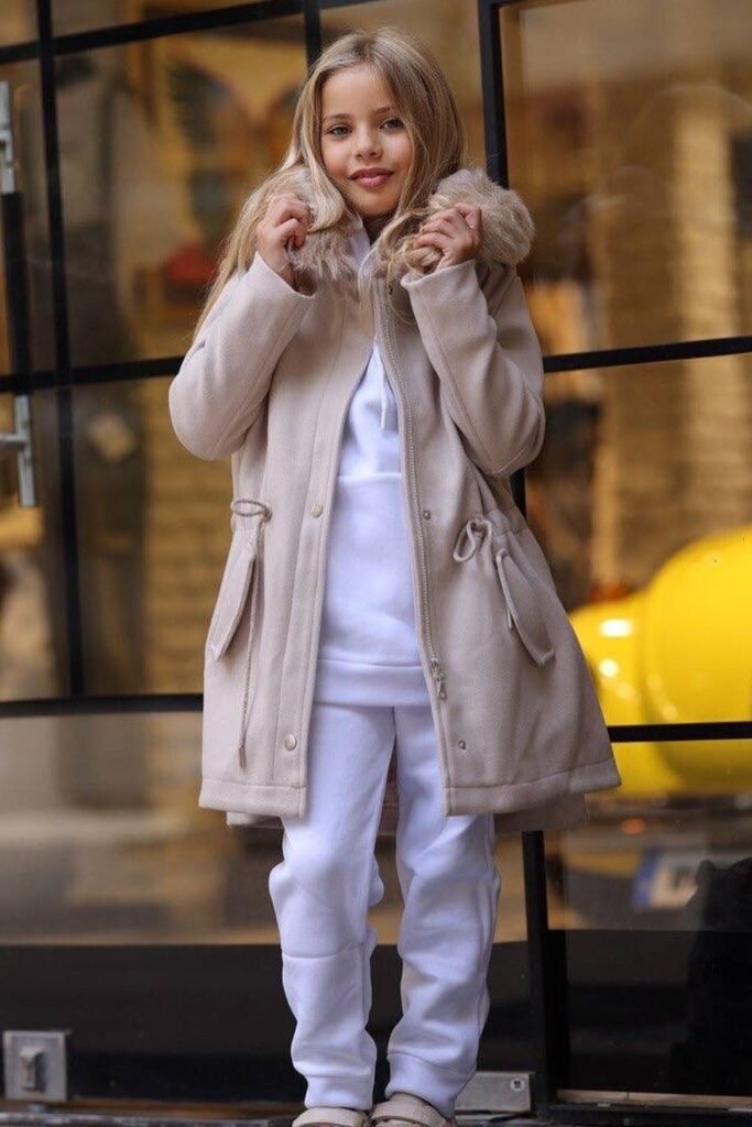 29. Beige Knit Sweater Set + Light Blue Knit Hooded Jacket with Fur Lining