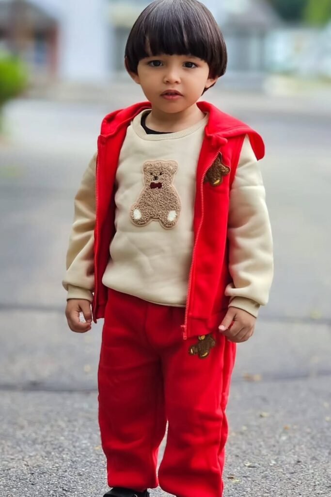 Description: This layered loungewear outfit is practical and cute. A beige sweatshirt with an adorable teddy bear patch is layered under a warm red hoodie vest. Red pants continue the color theme, and black shoes are ready for a quick trip outside.