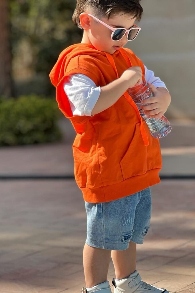 Description: This look is ideal for a crisp, cool fall or winter day. A bright orange hoodie vest layered over a simple white t-shirt adds warmth without restricting arm movement. Denim shorts and white sneakers keep it casual and cool, while pink sunglasses add a fun accessory.