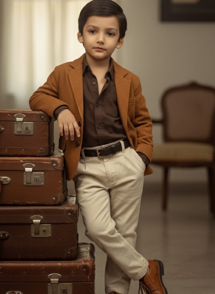 Description: This is a sharp, dapper outfit for a little gentleman. A smart brown blazer is layered over a dark shirt. It’s paired with clean beige trousers and matching brown shoes, creating a look that is perfect for a wedding, holiday service, or formal photo.