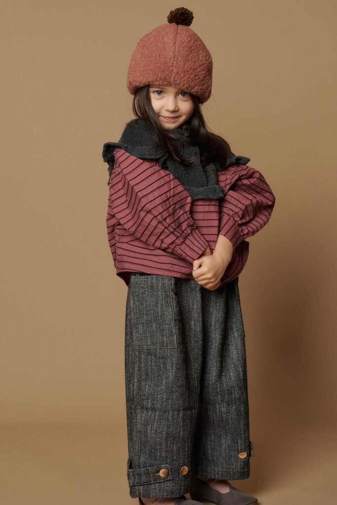 Description: This outfit has a vintage, intellectual vibe, like a little professor or artist. A beautiful burgundy striped blouse with a dramatic ruffle collar is the statement piece. It’s paired with simple grey wide-leg pants, a rust brown knit hat, and grey shoes.
