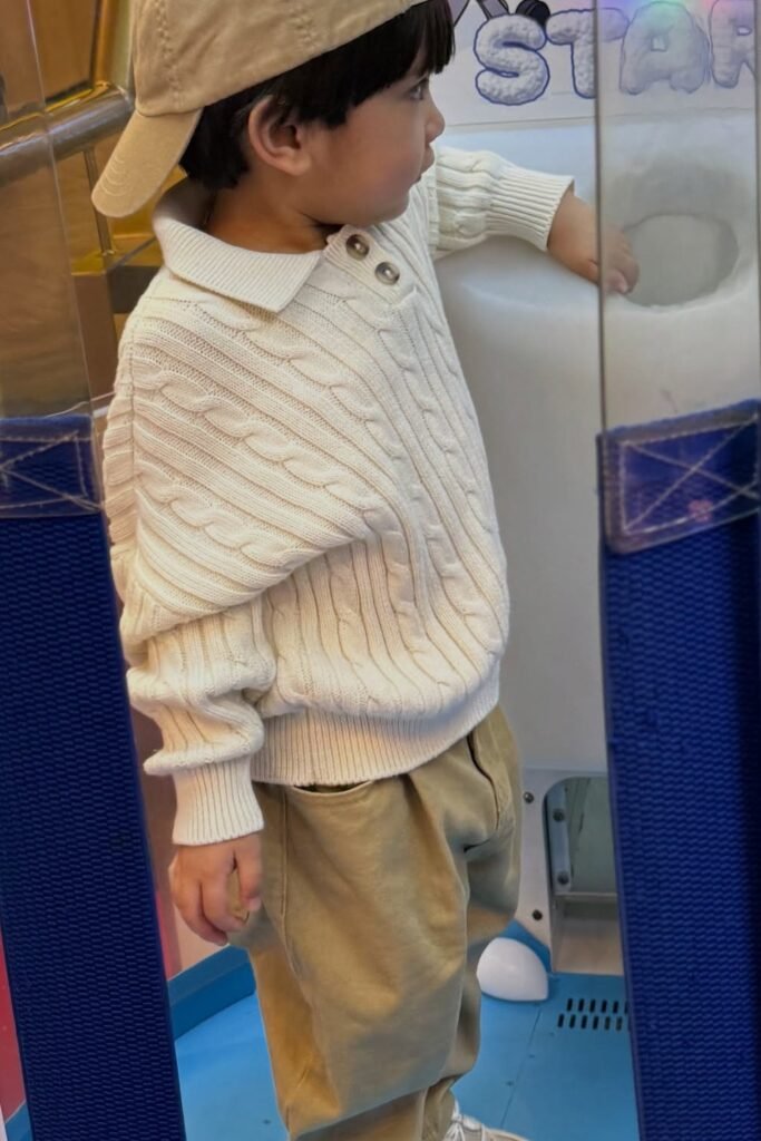 Description: This is a sweet, neutral outfit that is both classic and comfortable. A cream knit sweater with cute button details is paired with easy-going beige pants. A beige cap and crisp white sneakers finish the look, making it perfect for a casual day out.