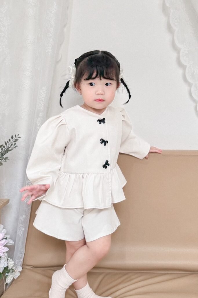 Description: This is a delicate and elegant outfit for a formal event or photo session. A cream peplum top with sophisticated black bow details is paired with matching cream shorts. Light pink socks add a soft, sweet touch of color.