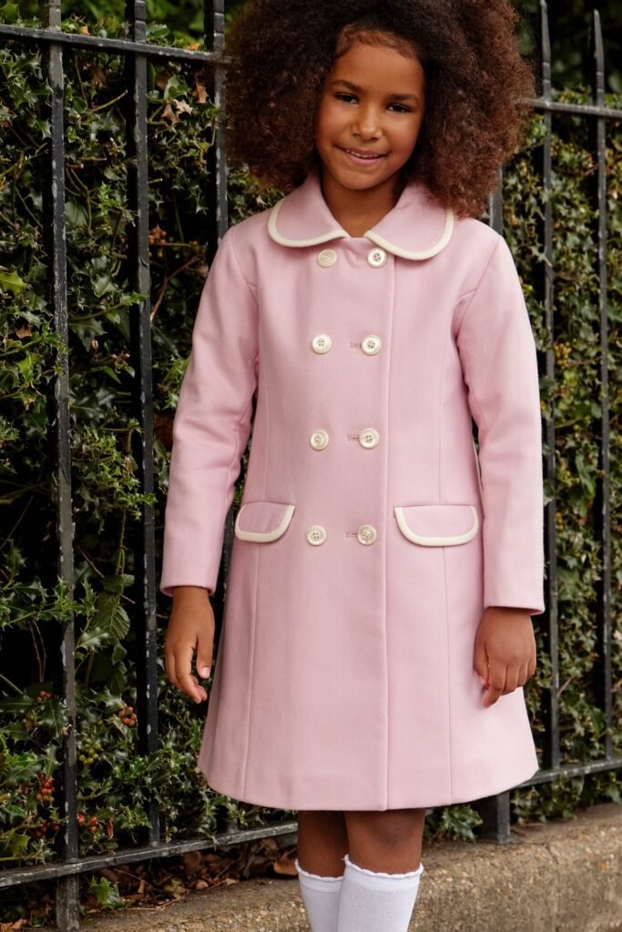 Description: While this features a coat, it has a classic, dressy feel perfect for a special at-home occasion like a birthday. A beautiful light pink double-breasted coat with white trim is paired with pretty white knee socks, creating a doll-like, vintage-inspired look.