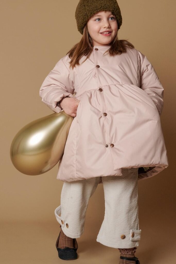 9. Light Pink Puffer Coat + White Corduroy Pants with Button Details + Olive Knit Beanie + Black Shoes