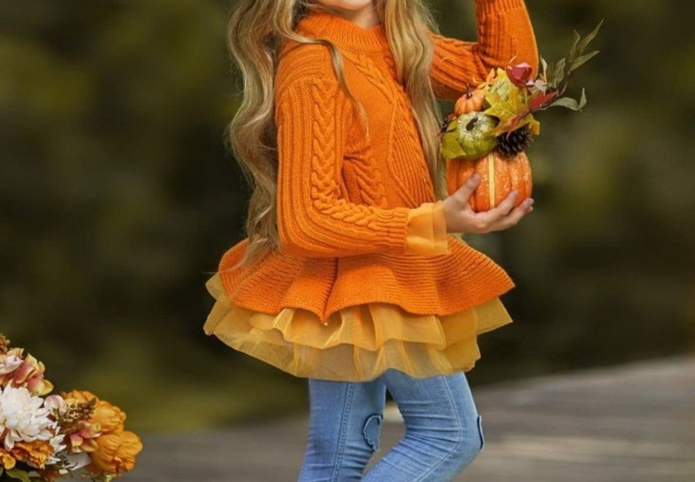 Description: A fun and playful take on a party outfit. A bright orange peplum sweater features a magical, layered tulle hem for a pop of princess style. Paired with cool distressed jeans, it strikes the perfect balance between fancy and fun.